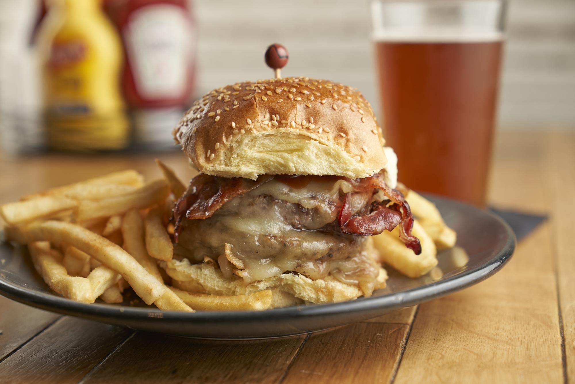Crispy Onions, Bacon, Cheddar Cheese & BBQ Sauce on top of a Juicy Burger