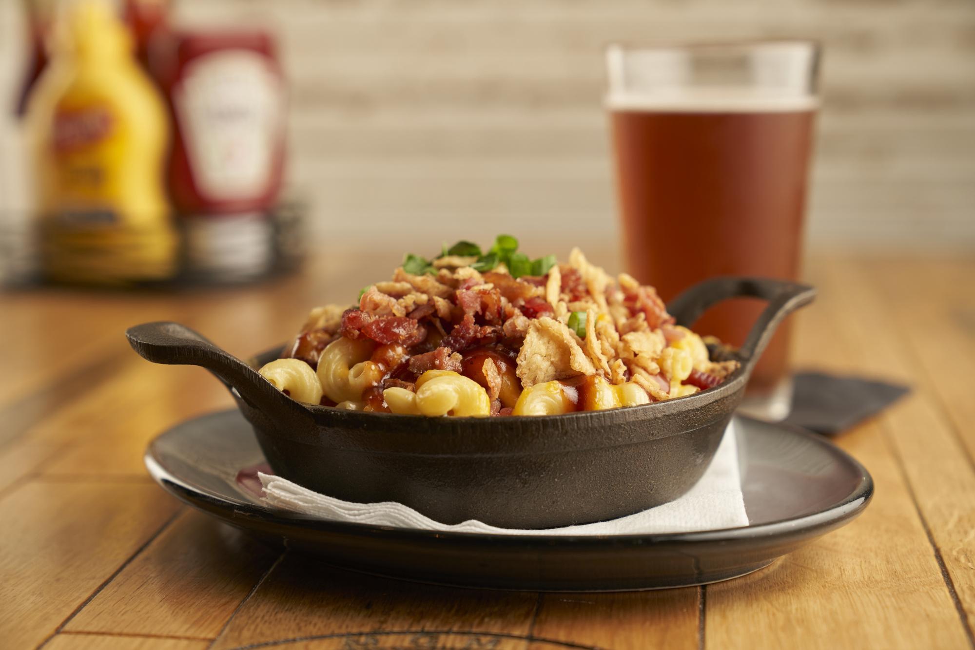 3 Cheese Macaroni & Cheese, with Chopped Bacon, BBQ sauce, Crispy Onions & Green Onions
